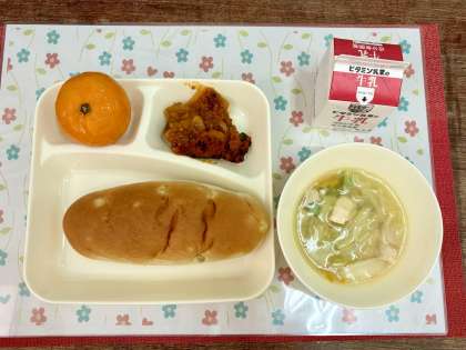 今日の献立は、かぼちゃのミートグラタン・鶏肉と野菜のスープ・冷凍みかん・おさつパン・牛乳です。
