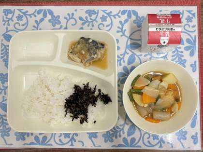 今日の献立は、さごしのおろしじょうゆかけ・含め煮・牛ひじきそぼろ・ごはん・牛乳です。
