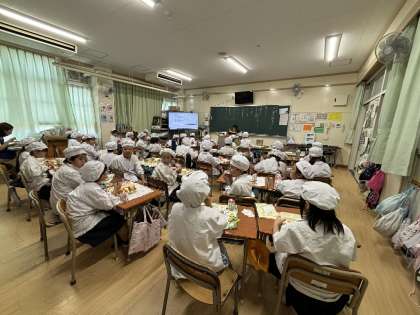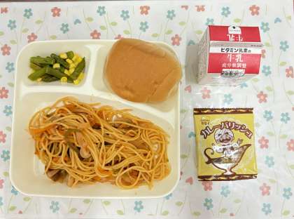 今日の献立は、イタリアンスパゲッティ・グリーンアスパラガスとコーンのサラダ・カレーフィッシュ・ミニコッペパン・牛乳です。