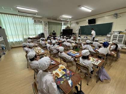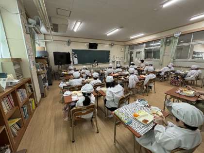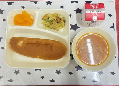 今日の献立は、カレーマカロニグラタン・トマトスープ・みかん(缶)・おさつパン・牛乳です。