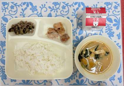 今日の献立は、鶏肉のてり焼き・かぼちゃのみそ汁・なすのそぼろいため・ごはん・牛乳です。