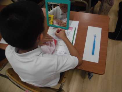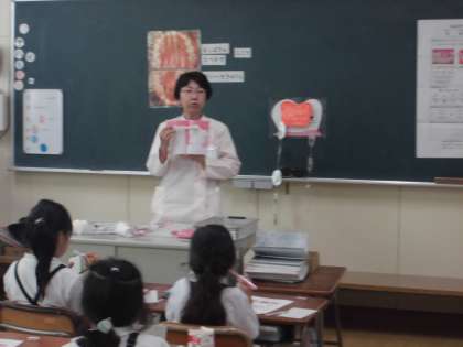 歯科衛生士さんによる歯みがき指導がありました。むし歯の予防について、間食の摂り方、第一大臼歯の大切さなどを教えていただき、歯垢を染め出して歯みがきをがんばりました。みがきにくいところも工夫しながらみがきました。