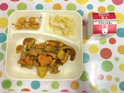 今日の献立は、チキンカレーライス・キャベツとコーンのサラダ・さくらんぼ(缶)・牛乳です。