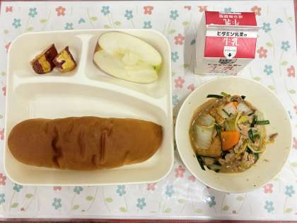 今日の献立は、中華煮・大学いも・りんご・黒糖パン・牛乳です。