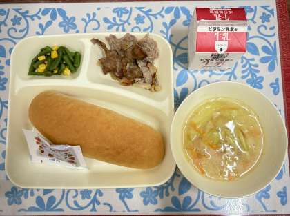 今日の献立は、豚肉のガーリック焼き・鶏肉と野菜のスープ・さんどまめとコーンのソテー・コッペパン・いちごジャム・牛乳です。