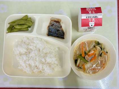 今日の献立は、さごしの塩こうじ焼き・みそ汁・えだまめ・ごはん・牛乳です。