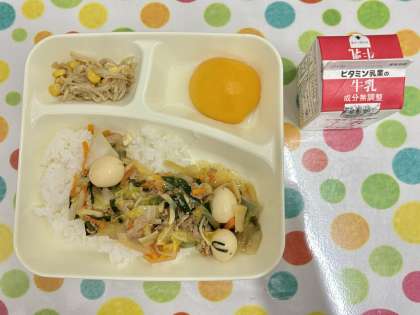 今日の献立は、中華丼・もやしとコーンのごまいため・黄桃(缶)・牛乳です。
