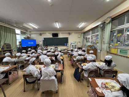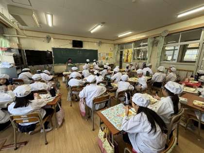 中華丼は、大人気の献立です。豚肉やうずらたまご、はくさい、たけのこ、にらなど具だくさんの具材をごはんにかけたボリューム満点のどんぶりで、おかわりをする児童が多く、大好評でした。