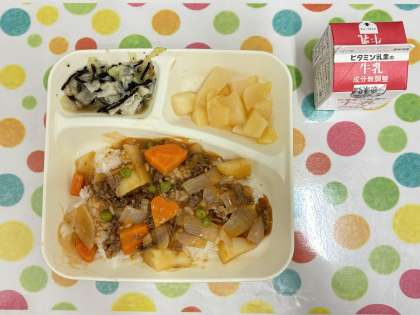 今日の献立は、ハヤシライス・キャベツのひじきドレッシング・白桃(カット缶)・牛乳です。