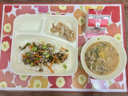 今日の献立は、もずくと豚ひき肉のジューシー・さつまいものみそ汁・焼きれんこん・ごはん・牛乳です。