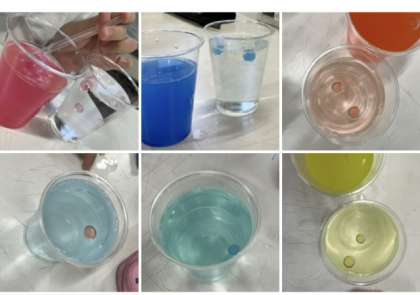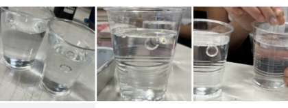 まずは、水(200ml)を2つのコップに入れ、それぞれに洗剤10滴入れます。静かにかき混ぜ、ストローで吸い上げ片方のコップに上から垂らします。(上の写真)