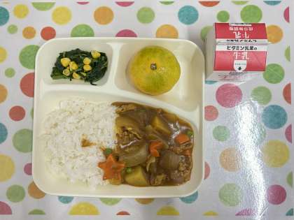 今日の献立は、ポークカレーライス・ほうれんそうのソテー・みかん・ごはん・牛乳です。