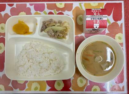 今日の献立は、豚肉と野菜のいためもの・いわしのつみれ汁・かぼちゃういろう・ごはん・牛乳です。