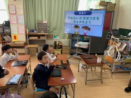 今日は、魔法のクリームを塗ってライトに当てると、手についている汚れが目に見える実験をしました。