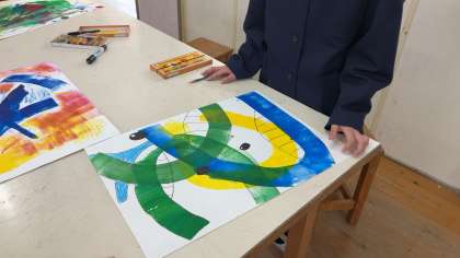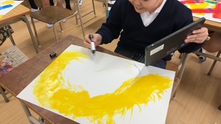 絵の具をつけたローラーを自由に画用紙へコロコロ、シュッシュッ、サーっと描きます。