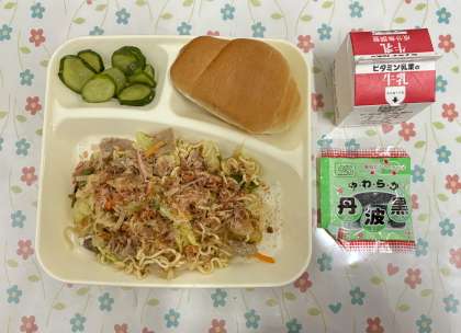 今日の献立は、和風焼きそば・きゅうりのしょうがづけ・ソフト黒豆・ミニコッペパン・牛乳です。