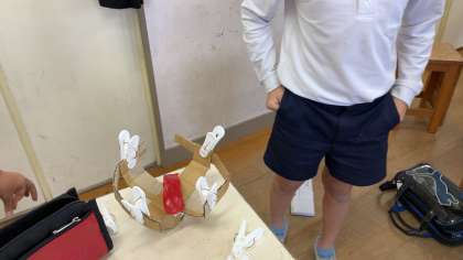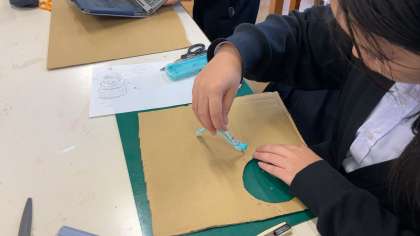 ダンボールを切って、木工用ボンドでとめて作品を作ります。