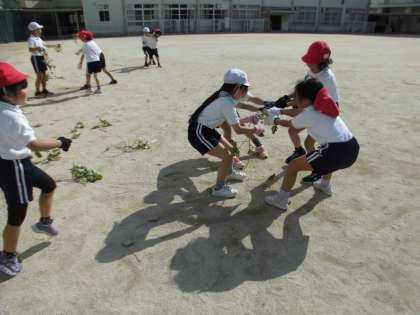2年生みんな大切に育ててきたサツマイモの収穫を11月に行いました。大小様々なサツマイモを収穫することができました。収穫後は、サツマイモのツルで、つなひきをしたり、なわとびをしたりして遊びました。