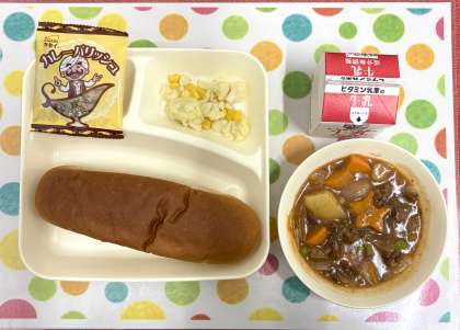 今日の献立は、ビーフシチュー・カリフラワーとコーンのサラダ・カレーフィッシュ・黒糖パン・牛乳です。