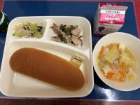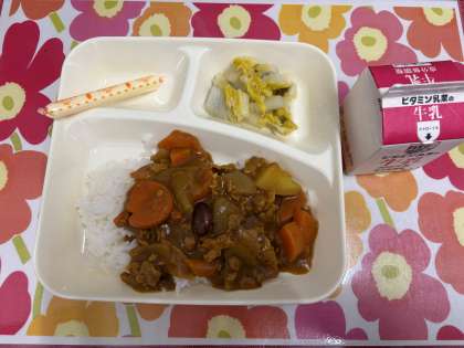 今日の給食は、豚肉と金時豆のカレーライス、牛乳、はくさいのピクルス、棒チーズです
