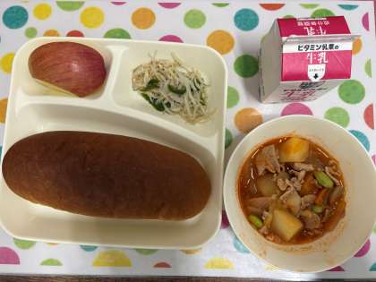 「黒糖パン、牛乳、ケチャップ煮、ささみと野菜のソテー、りんご」です。