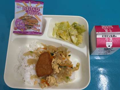 今日の給食は、「カツ丼、牛乳、キャベツの梅風味、いもけんぴフィッシュ」です。