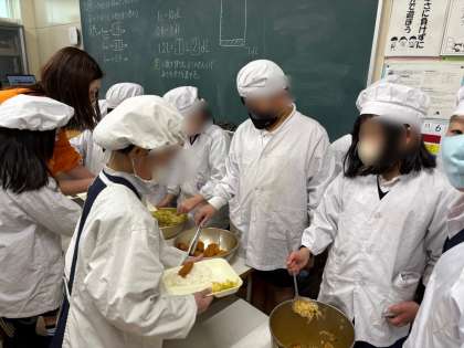 右の写真は3年生の配膳の様子です。エプロン、帽子、マスクをつけて上手に配膳しています。