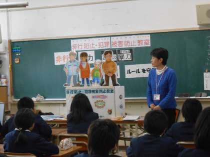 1月12日 中央少年サポートセンターの方が来校され、5年生の児童に「非行防止教室」を開いてくださいました。子ども達は、日常生活の正しい過ごし方や犯罪に巻き込まれないためにどのようにすればよいかなどをを真剣に学びました。