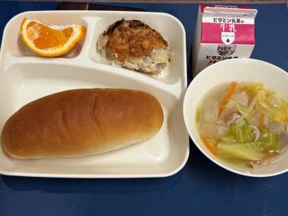 今日の給食は、「おさつパン、牛乳、押麦のグラタン、スープ、デコポン」でした。