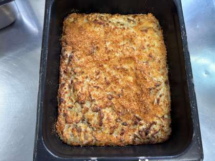 大麦の皮とぬかを取り、蒸してやわらかくなったところをローラーで平たくしたものが「押麦」です。今日のグラタンは、押麦がふっくらやわらかくなるように炒め煮され、表面は粉チーズとパン粉でカリッと香ばしく焼き上がり、とても美味しかったです。
