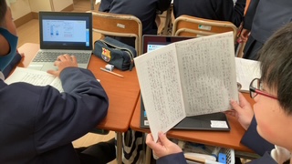 発表ノートに資料をはりつけ、発表原稿に合わせて修正をし、話す練習をしています。