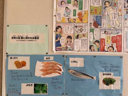 なのはなは、「なばな」や「はなな」とも呼ばれます。皮ふやのど、鼻の粘膜を強くするカロテンを多く含んでいます。少し苦みがあり、苦手な子が多い様子でしたが、頑張って食べていました。春の訪れを感じられる素材でした。