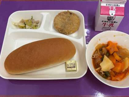 今日の給食は、「コッペパン、バター、牛乳、チキンレバーカツ、ケチャップ煮、ツナとキャベツのバジルソテー」でした。