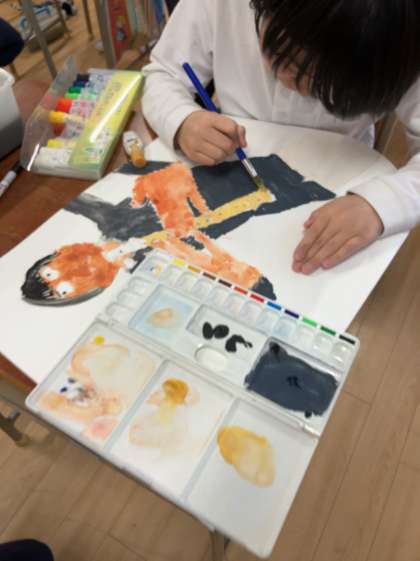 自分の肌の色を見ながら、赤、黄、青を混ぜて色をつくり、肌の流れにそってぬりました。