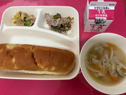 今日の給食は、「おさつパン、牛乳、豚肉のガーリック焼き、スープ、ツナとキャベツのソテー」でした。