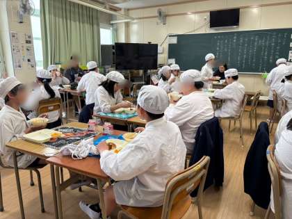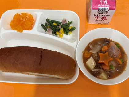 ビーフシチューは、トマトピューレ、ウスターソースなど9種類の調味料・香辛料をブレンドしてじっくり煮込み、上新粉でやさしくとろみをつけた子どもたちに人気のメニューです。とても美味しく、ラッキー人参もあって、たくさんの笑顔が教室中にあふれ、幸せな時間となりました。