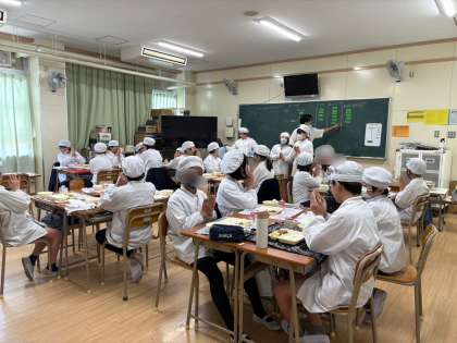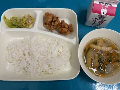 今日の給食は、「ごはん、牛乳、鶏肉のたつたあげ、五目汁、キャベツの梅風味」でした。