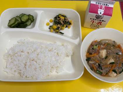 今日の給食は、「ごはん、牛乳、マーボーどうふ、きゅうりの中華あえ、ツナとチンゲンサイのいためもの」でした。