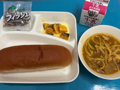 今日の給食は、「黒糖パン、牛乳、カレースープスパゲッティ、かぼちゃのマリネ焼き、ミニフィッシュでした。