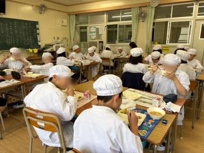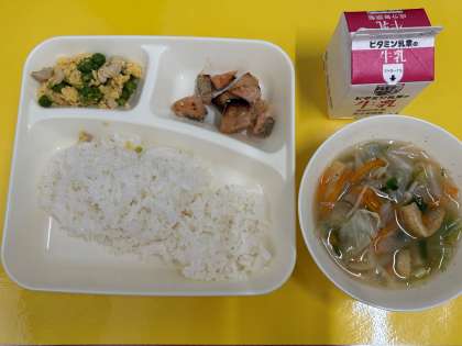 今日の給食は「ごはん、牛乳、さけのみそ焼き、五目汁、えんどうの卵とじ」でした。