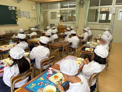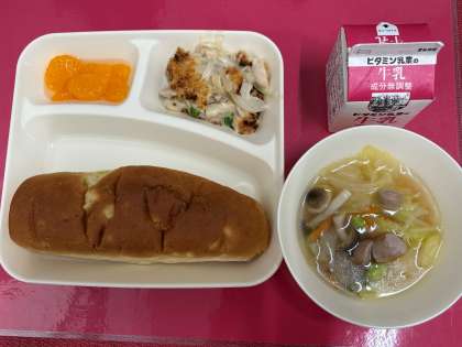 今日の給食は、「おさつパン、牛乳、マカロニグラタン、ウインナーとキャベツのスープ、みかん(缶)」でした。