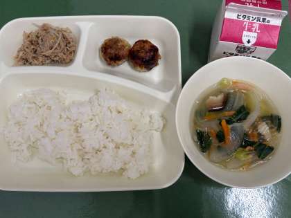 今日の給食は、「ごはん、牛乳、焼きシューマイ、鶏肉とはるさめのスープ、ツナともやしのいためもの」でした。