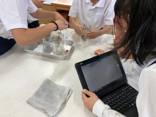 タブレットで動画を記録しながら様子をみると、つぶの細かい校庭の土は水がしみこみにくかったです。