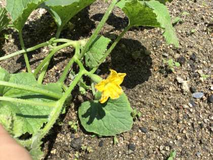 玉造黒門越瓜(たまつくりくろもんしろうり)の苗から、かわいらしい黄色の花が咲きました。
