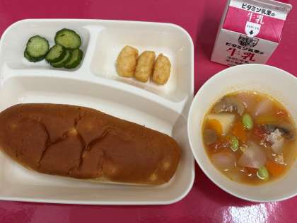 今日の給食は、「おさつパン、牛乳、いかのてんぷら、フレッシュトマトのスープ煮、きゅうりのバジル風味サラダ」でした。