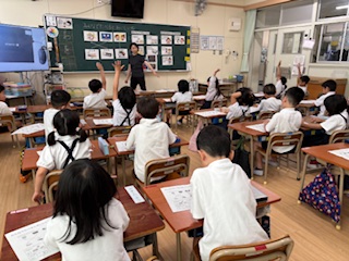 学習後の給食では、「スプーンをちゃんと揃えてかたづけないと!」「きれいにたべようね」