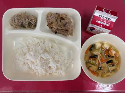 今日の給食は、「ごはん、牛乳、豚肉のしょうが焼き、五目汁、ツナと野菜のいためもの」でした。