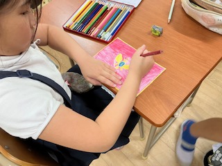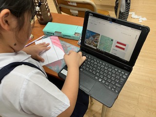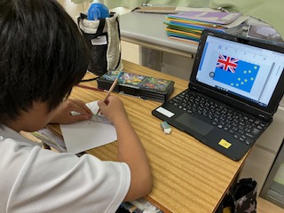 9月の靴箱前の掲示板担当が中学年なので、万博に出展している国の国旗を描いて掲示することにしました。