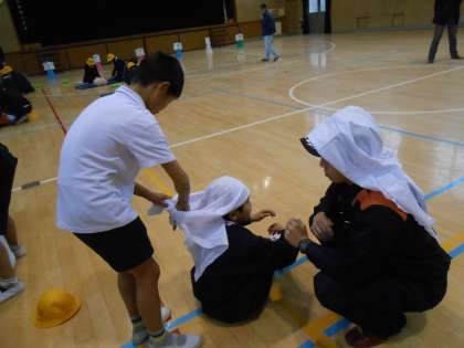 2月20日 本校で土曜授業を実施しました。今回の土曜授業は、地域の皆様、東成消防署、東成区役所の皆様にご協力をいただき行うことができました。あいにくの雨模様で外気温は冷たかったですが、子ども達は、地域ごとに8つの班に分かれ、救助法(心肺蘇生法 けが人の運搬など)、非常食の試食、災害時の無線の操作など8つのポイントで防災についてたくさんのことを学ばせていただきました。この日の防災訓練で、自分の命を守ることをひとり一人の子どもが学ぶことができたと思います。地域の皆様、消防署、区役所の皆様、防災訓練に多大なご支援をいただきありがとうございました。