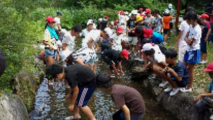 びっくりするくらい冷たい水ですが、子どもたちは、なんのその、必死に魚を追いかけています。うまくつかめない子もいたかもしれませんが…つかんだ魚(あまめ)は、塩焼きにしていただきます。大切な命をいただきます。残さずしっかり食べましょう。
